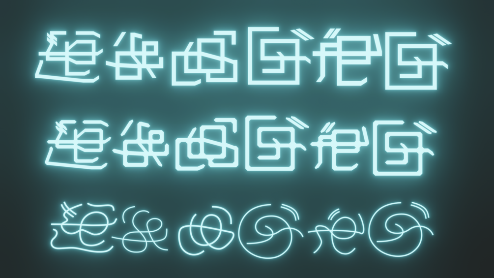 - An .otf file that was made with FontForge, containing a third version that can be installed as a font and typed as a text object or used in a 2D design program. (not fully tested with word processors)